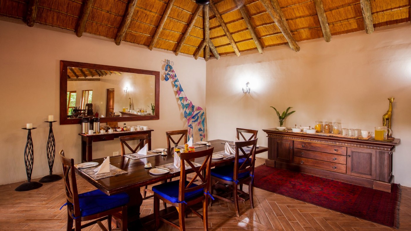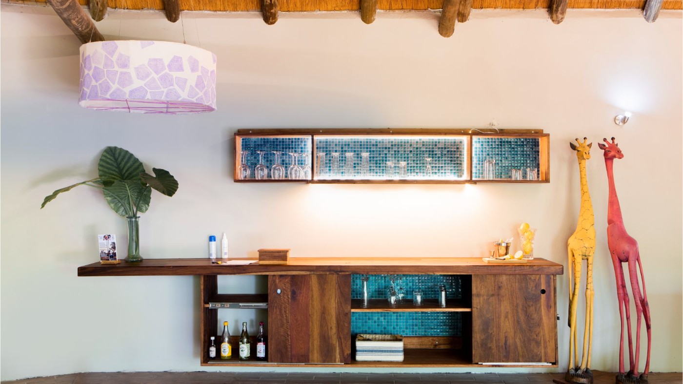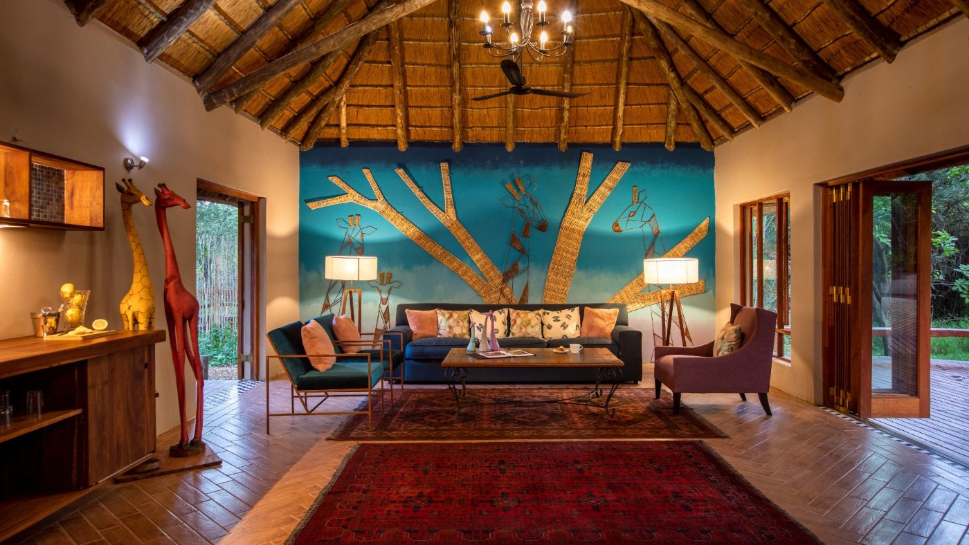 The spacious, thatched guest area is the heart of Thamo Telele. Large doors open onto a wide-angle teak deck shaded by Motsentsela trees, under which guests exchange stories, meals and drinks. Inside, you’ll find plush leather furnishings from which to enjoy a drink from the bar. Explore the large selection books on the nation’s explorers and history.