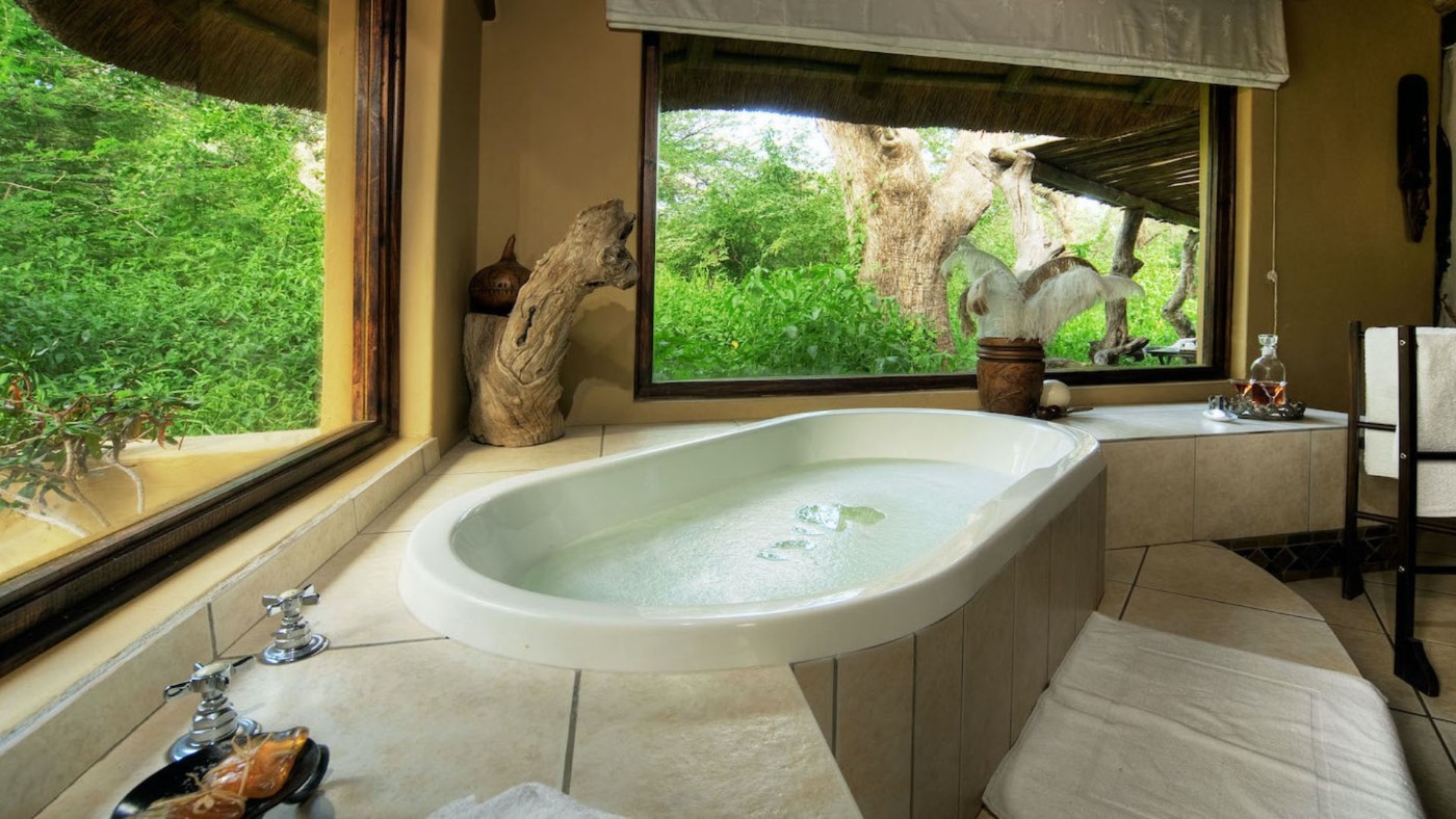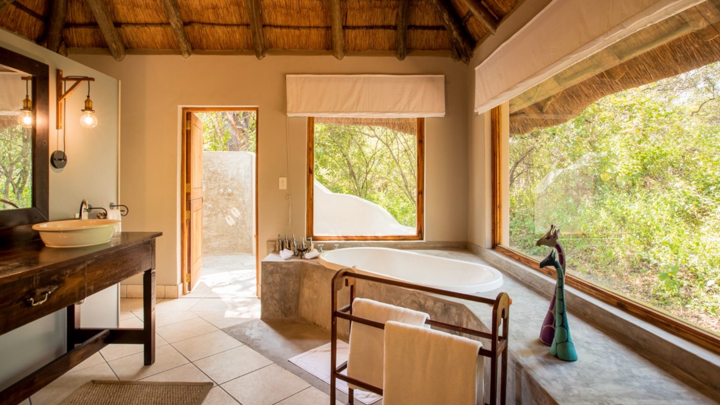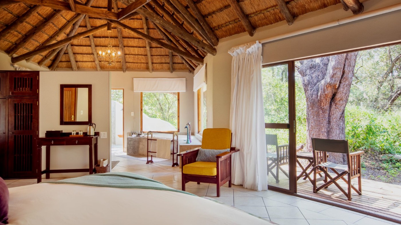 The spacious, thatched guest area is the heart of Thamo Telele. Large doors open onto a wide-angle teak deck shaded by Motsentsela trees, under which guests exchange stories, meals and drinks. Inside, you’ll find plush leather furnishings from which to enjoy a drink from the bar. Explore the large selection books on the nation’s explorers and history.